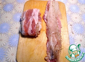 Бекон разложить, слегка подсолить, поперчить ( можно взять любые любимые специи) и сверху на него уложить полоску рыбы. Сложить или пополам, или свернуть вдвое. Снизу закрепить зубочисткой, чтоб при жарке не распадались.