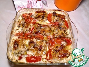 Выкладываем смесь ложкой к рыбе, заполняя пустоты. Помидор нарезать на дольки и разложить между рыбой. Помидоры хорошо подходят, если сорт сливка, в них меньше сока и они хорошо держат форму в готовом блюде. Посыпать сверху нарезанной зеленью. Накрыть сверху фольгой.
