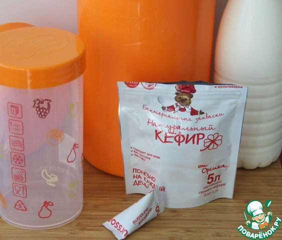 Одновременно заквашиваем молоко на кефир. Благодаря йогуртнице-термос и закваске кефир от Oursson, это не составит большого труда. Добавить в емкость для приготовления 1 пакетик закваски кефир, влить молоко.