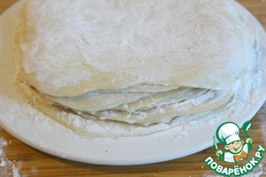 Посыпаем каждую лепешку крахмалом и складываем стопочкой.
