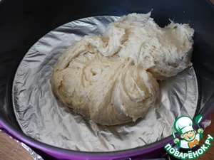 Для приготовления пирога возьмите разъемную форму диаметром 18 см, дно формы застелите фольгой или пергаментом. Выложите в форму половину теста.