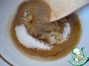Вылейте масло в чашку и добавьте сахар. Дайте массе немного остыть.
