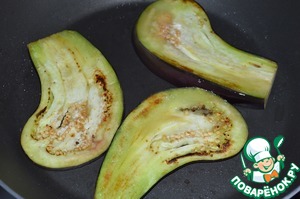 Баклажаны нарезать вдоль на ломтики и обжарить до мягкости на растительном масле. Выложить на бумажное полотенце. Кожицу удалить. -