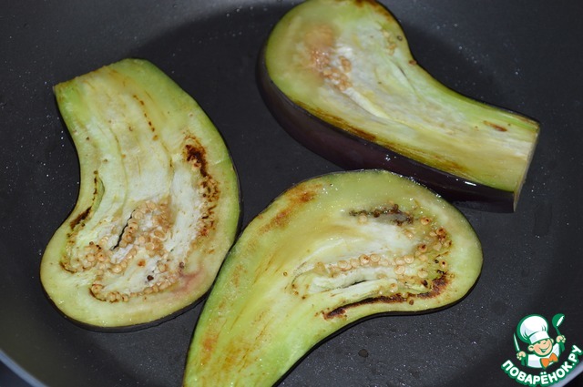Баклажаны нарезать вдоль на ломтики и обжарить до мягкости на растительном масле. Выложить на бумажное полотенце. Кожицу удалить.