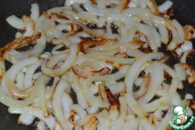 Лук нарезать полукольцами и обжарить до золотистого цвета на растительном масле. Выложить на бумажное полотенце.