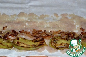 На фарш выложить жареный лук и баклажаны. -