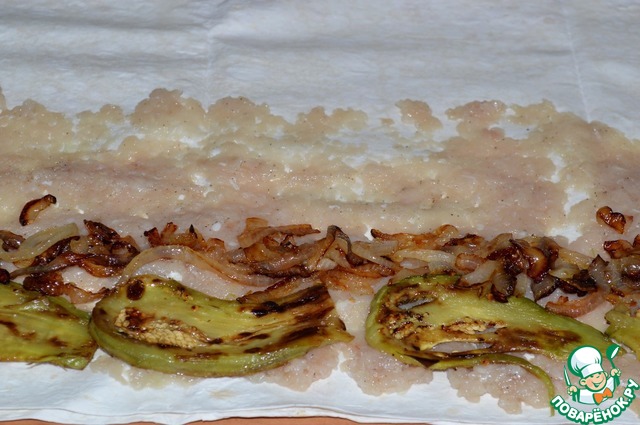 Смазать по длинной стороне до половины листа фаршем.