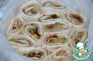 Свернуть лаваш с начинкой в рулет.
