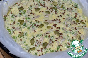 • Залить готовой заливкой пирог, посыпать семечками и отправить в разогретую до 180*С духовку.