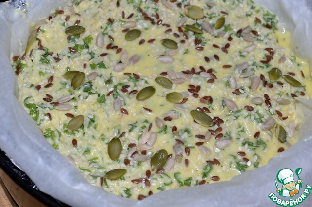 Залить готовой заливкой пирог, посыпать семечками и отправить в разогретую до 180*С духовку.