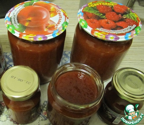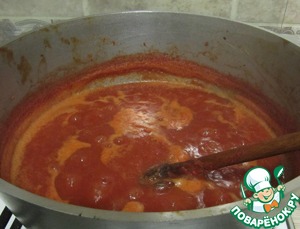 Помидоры пропускаем через мясорубку, затем протираем через сито. Сливы тоже пропускаем через мясорубку и тоже через сито. Всё это соединяем и варим 1 час с момента закипания, помешивая. Добавляем сахар, соль, аджику. Аджику я беру грузинскую, весом 120 грамм. На мой вкус там содержатся все необходимые пряности для мягкого вкуса. Размешать. Варить ещё минут 20 – 30. За 5 минут до окончания варки добавляем 70% уксусную эссенцию – 1 чайную ложку.