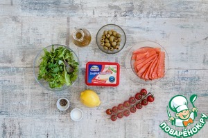 Ингредиенты для «Зеленый салат с роллами из лосося и сыра»:
