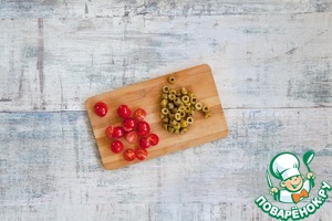 Разрежьте оливки и помидоры черри пополам.