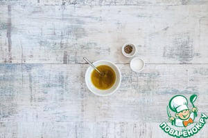 Для заправки смешайте оливковое масло с лимонным соком, солью и перцем.