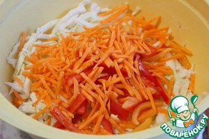Добавить перец болгарский и морковь, нашинкованные соломкой, добавить натертое на терке очищенное яблоко.