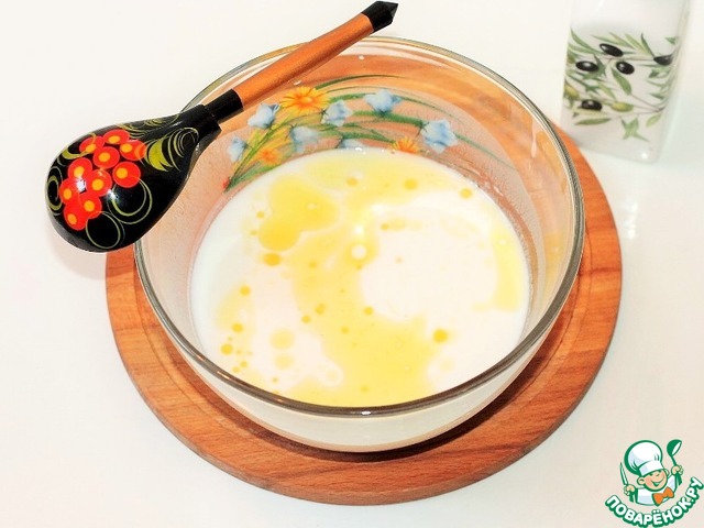 3. Кефир (500 мл) комнатной t выливаем в большую миску. Добавляем оливковое масло (1 ст. л. ) и соль.