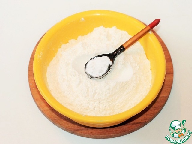 4. В муку добавляем пищевую соду (1 ч. л.), перемешиваем ложкой и затем просеиваем.