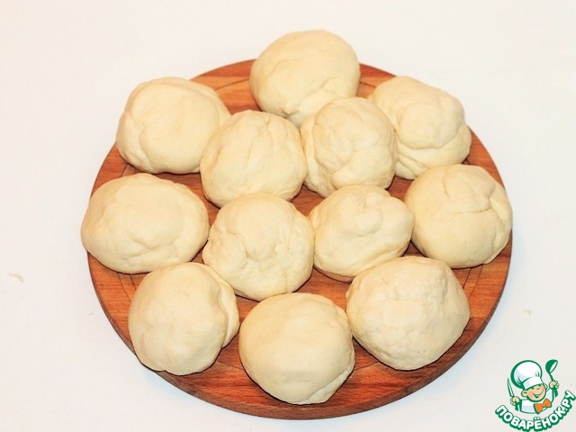 11. Делим тесто на 12 частей. У меня вес каждой части от 65-70 грамм. Накрываем тесто прозрачным пакетом или пленкой, чтобы не обветрилось.