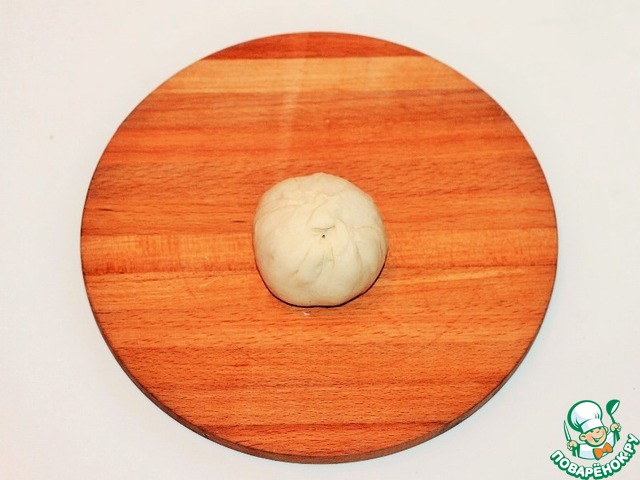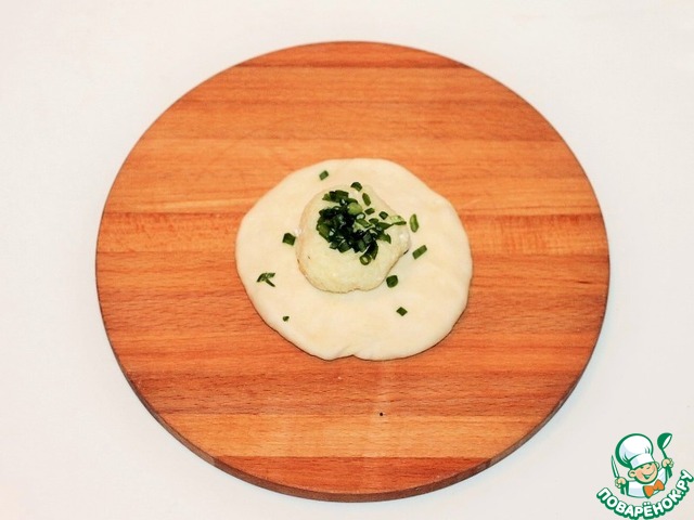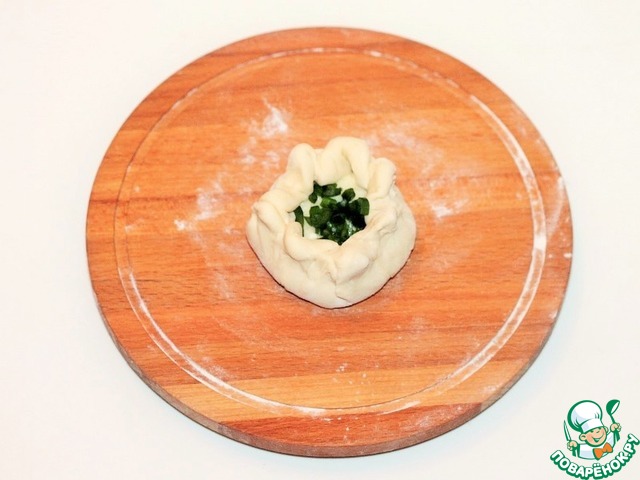 14. Получается узелок с начинкой внутри. Переворачиваем лепешку узлом вниз (и там, где будет серединка лепешки, подпылить немного мукой).