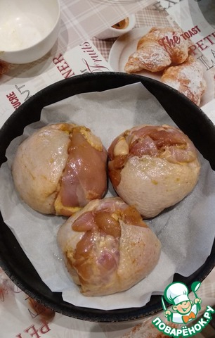 5) Взять касушку или салатницу подходящего размера (на фото она видна). Уложить туда курицу чтобы она покрыла ее полностью. У меня были маленькие бедра, поэтому я использовал по два на одну долму.