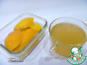 Откупорьте банку с консервированным манго (вариант-персики). Сироп процедите (сироп= 200 мл.), ломтики манго (250 г.) нарежьте мелким кубиком. Желатин замочите в сиропе от манго, в двух чашках: