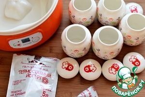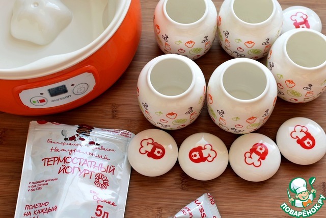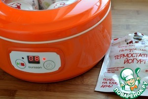 Я готовила йогурт в прекрасной йогуртнице от Oursson – стильной, жизнерадостно-оранжевой и удобной. Такой гаджет, помимо основных функций, вполне может служить украшением кухни! Это мой приз, полученный здесь, на “Поваренке”! Готовить в нем йогурт проще простого! Нужно только размешать подогретое до 25 градусов пастеризованное молоко с закваской, хорошенько размешав ее. Затем разлить молоко по чистым сухим баночкам - они идут в комплекте к йогуртнице и такие мимимишные!