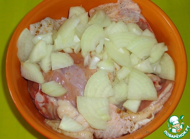 И какой же маринад без лука? Очищаем луковицы, режем средними кусками. Добавляем лук к мясу.