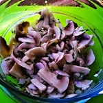 Нарезанные грибы выкладываем в миску, посыпаем солью и осторожно перемешиваем кончиками пальцев. Важно не переборщить с солью, но и не насыпать недостаточно - грибы должны начать давать сок. Поэтому пробуем на вкус и корректируем если надо.