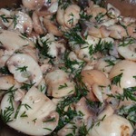 Укроп нарезаем средне. Для усиления вкуса укропа, можно растереть его плоской стороной ножа с солью и чесноком (тогда он пустит сок быстрее), но я этого не делал, потому-что люблю, когда укропчик находится целиком в грибах