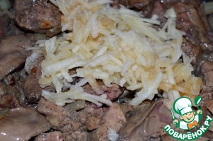 Как только печень схавится, добавить натертое яблоко и жарить 1 мин.