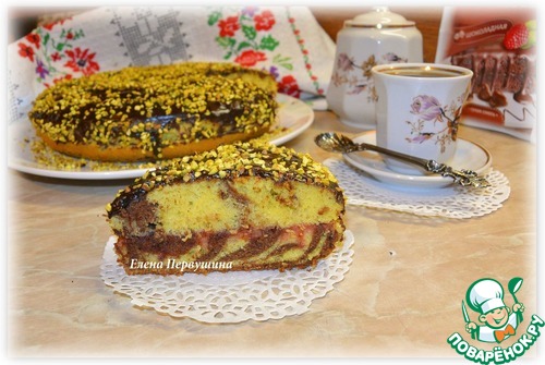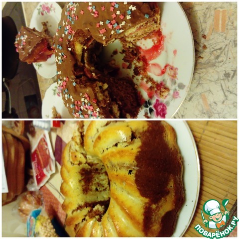 В форму залить поочередно столовой ложкой то светлое тесто, то темное.