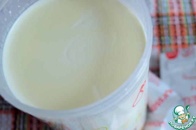 В чистую, простерилизованную банку налить 1 л молока комнатной температуры (22-24*C), всыпать 1 пакетик закваски, тщательно размешать до полного растворения закваски, минуты 2-3.