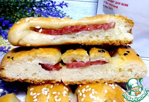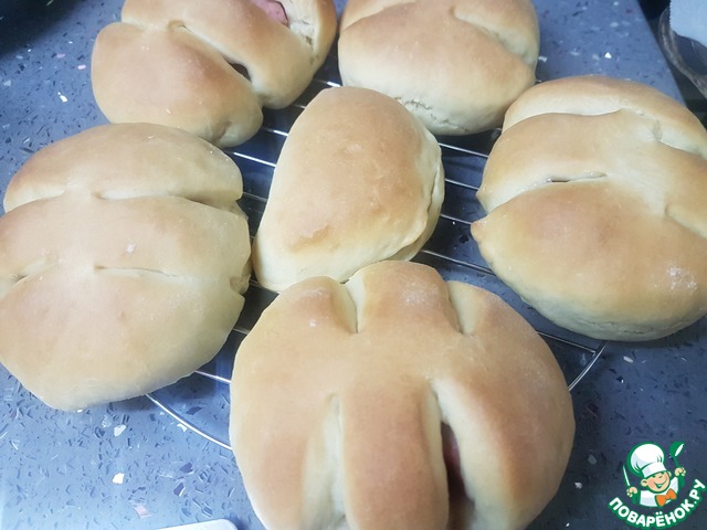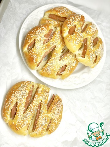Если колбаса, допустим, 7 см в диаметре, то шарики делать по 45-50 г, а если, как у меня, 9 см, то я взвешивала по 55-56 г, подгоняла, чтоы тесто ушло без остатка. -