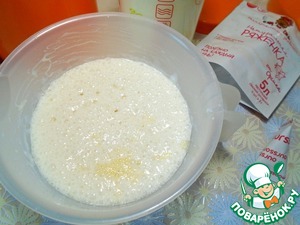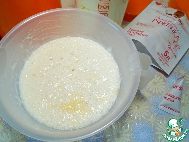 Сразу, в теплую еще ряженку, добавить дрожжи и сахар. Можно подогреть в микро немного, если остыла ниже комнатной температуры. Перемешать и отставить на 15 минут до образования пенной шапочки.