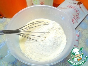 Добавить для начала третью часть муки и хорошо ее перемешать венчиком, чтобы не было комочков.