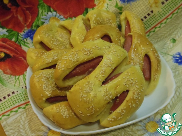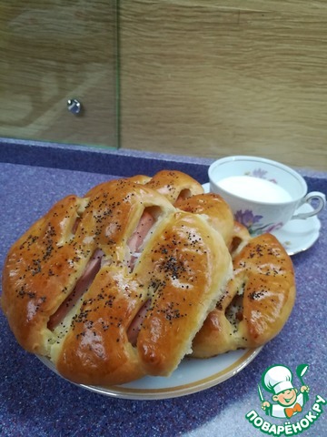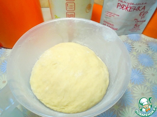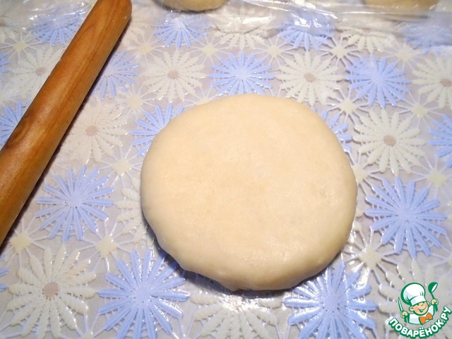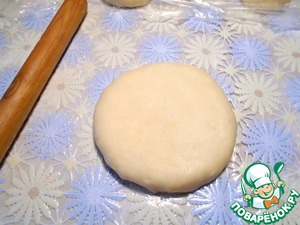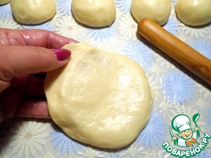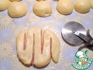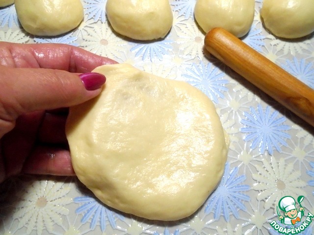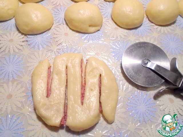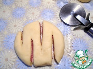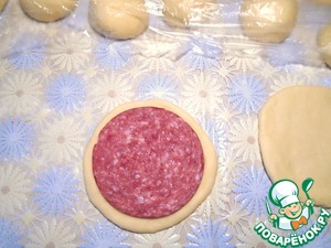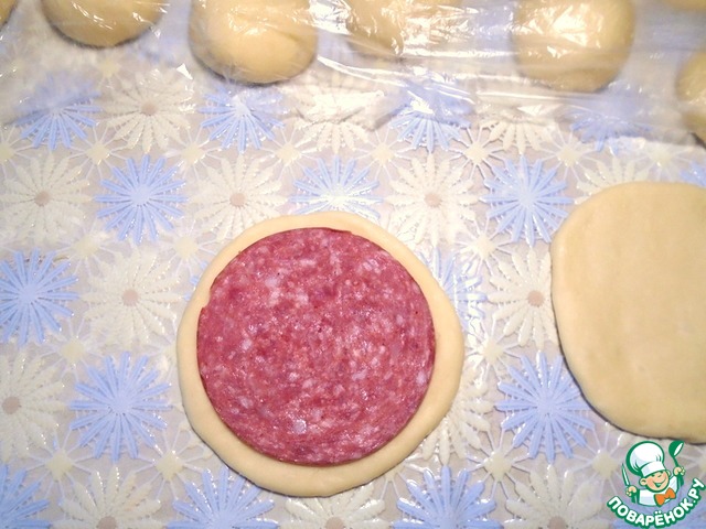 Раскатать один шарик в лепешку на 1 см больше, чем колечко колбасы. Хочу сказать, что для этого теста и скалка -то не нужна. Тесто прекрасно руками растягивается до нужного размера.