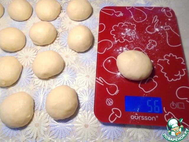 Тесто взвесить и разделить его на равное количество штук от 45-55 грамм плюс/минус.