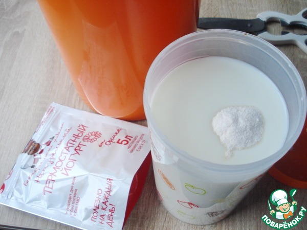 Емкость для приготовления йогурта простерилизуем. Вольем молоко комнатной температуры. В молоко добавим закваску для йогурта, тщательно перемешаем чистой, сухой ложкой до полного растворения закваски. Емкость закроем крышкой. В термос- йогуртницу нальем кипяток, до указанной метки. Поставим контейнер с молоком в термос-йогуртницу на 6-10 часов.