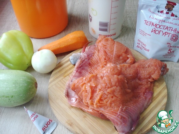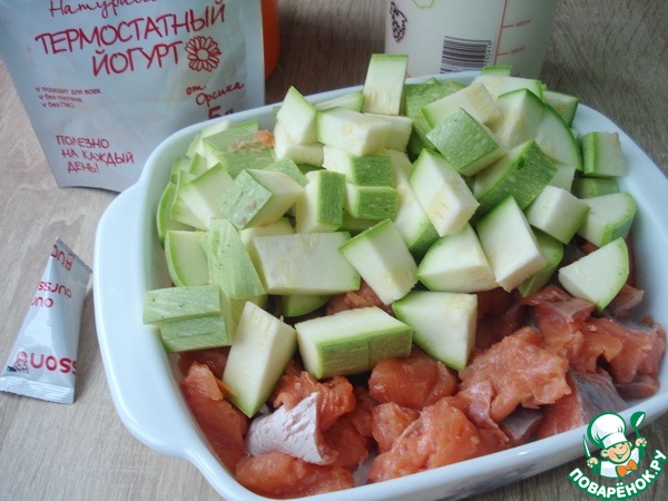 • Горбуша- филе, без шкурки. Нарежем на кусочки. Кабачок порежем на кусочки, как рыбку.
