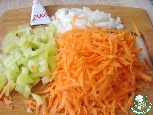 • Репчатый лук и болгарский перец нарежем. Морковь натрем на крупной терке.
