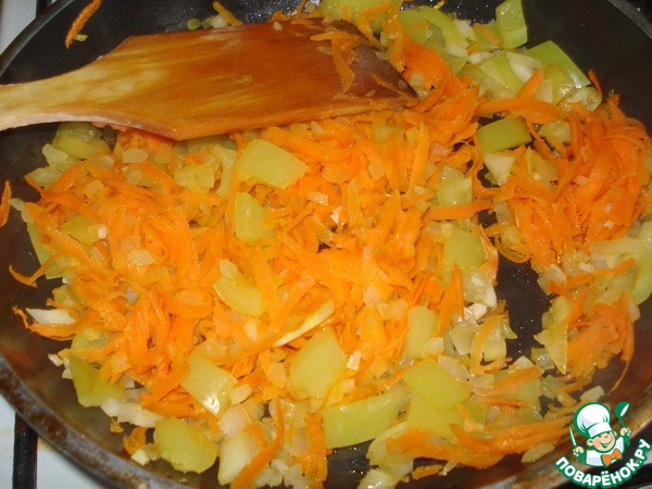• В растительном масле обжарим лук, морковь, болгарский перец до полуготовности.