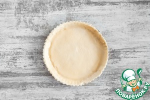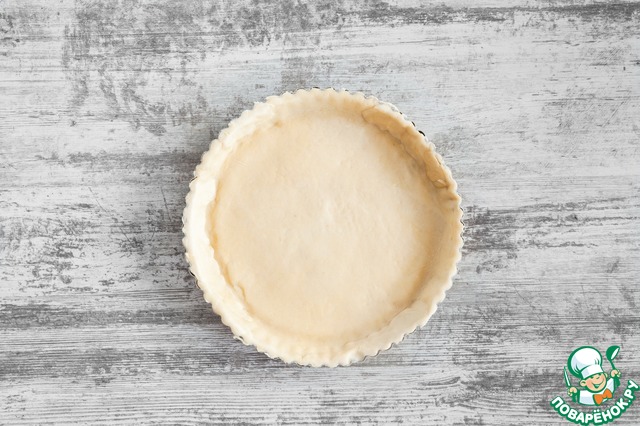 Тесто раскатайте в круг. Неглубокую форму для запекания диаметром 24 см застелите тестом, формируя дно и бортики. Пусть тесто свисает с бортиков, не срезайте его. Наколите тесто вилкой и поставьте в холодильник на 15–30 мин.