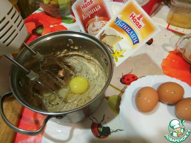 Небольшой набор продуктов для теста: сливочное масло комнатной температуры, коричневый сахар, молоко, яйца, мука с разрыхлителем, яблоко. В качестве пряностей щепотка мускатного ореха, ванилин и корица высшего сорта ТМ ХААС, как выяснилось, что не все то корица, что под ее видом продается. А вот корица высшего сорта ТМ Хаас радует своим нежнейшим и тонким ароматом, ни намека на горечь и терпкость!