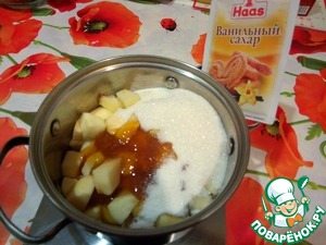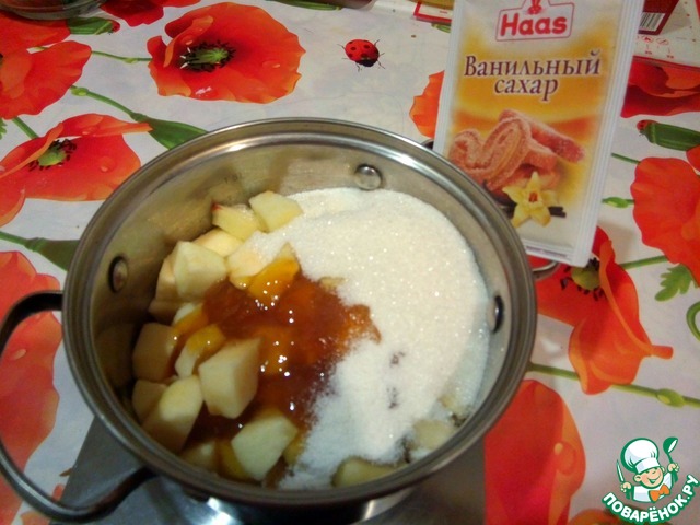 На фото также видно яблоки с сахаром и рыженьким абрикосовым джемом