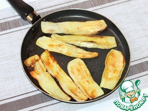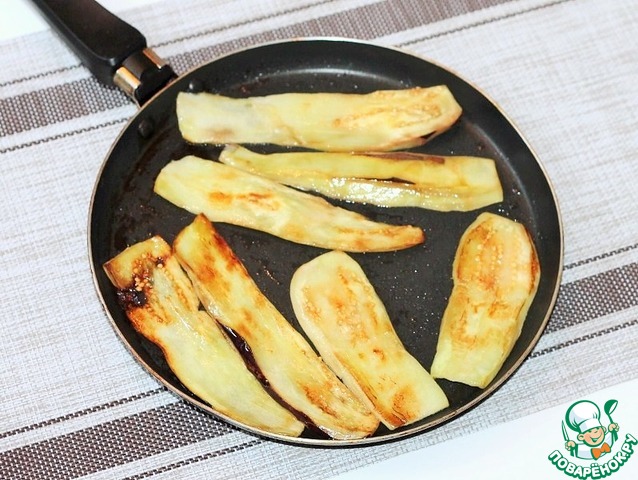 9). Обжариваем полоски баклажан на разогретом растительном масле с двух сторон. Если у вас нет вяленых чесночных помидор, то можно заменить их на баклажаны. Тогда обжаренные баклажаны пересыпать смесью: очищенный прессованный чеснок (2-3 зуб.) смешать с щепоткой соли и мелко порезанной кинзой или зеленью - по вкусу.