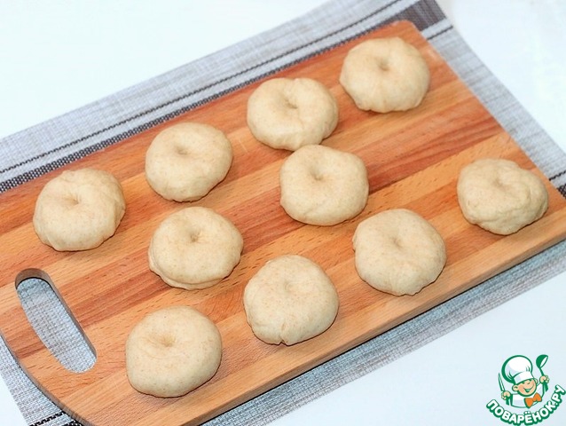 15. Противень застилаем бумагой для выпечки и смазываем растительным маслом. Силиконовый коврик не смазываем маслом. Выкладываем заготовки. Накрываем заготовки пленкой и отправляем в теплое место для увеличения бубликов. Я выставляю в духовке t 40 С и ставлю противень, минут на 20-30 до увеличения в 2-2,5 раза.