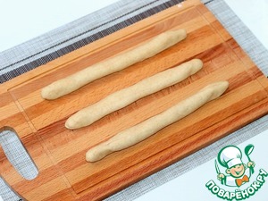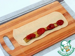 12). Затем каждую "колбаску" раскатать в узкую лепешку (~23 * 7 см) и выложить 2 пластины баклажан и 3-4 половики помидор.