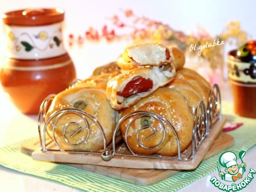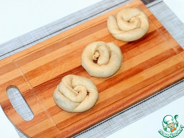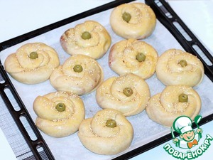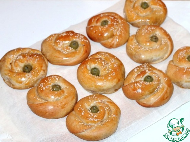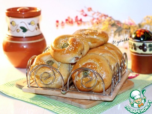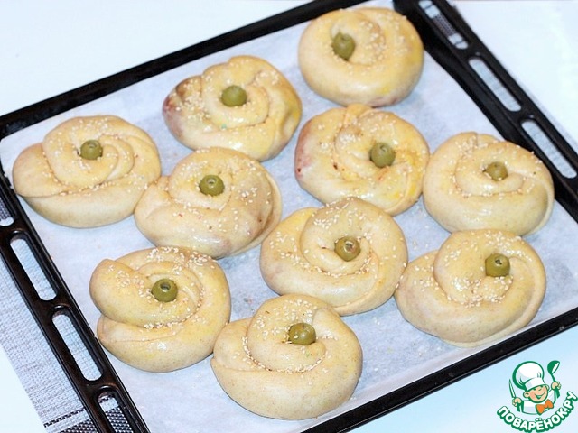 16). Затем кладем в серединку бублика оливку. Смазываем заготовки взбитым желтком, посыпаем обжаренным кунжутом или тмином и отправляем в заранее разогретую до 180 С духовку. Выпекаем бублики до золотистой корочки.