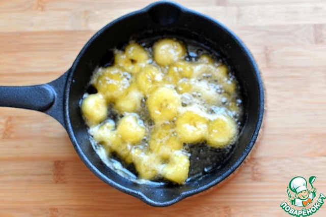 На сковороде растопите сахар и сливочное масло, добавьте нарезанные кружочками бананы и обжаривайте до карамелизации. Разложите по креманкам.