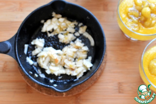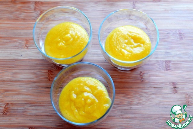 Манго протрите через сито, добавьте в полученное пюре лимонный сок и щепотку карри. Хорошо перемешайте и разложите по креманкам. Я делала три порции, но можно и четыре.